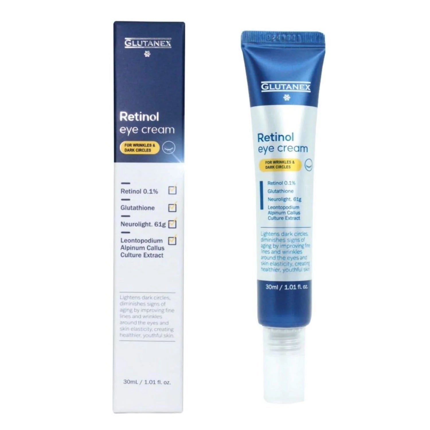 Glutanex Retinol Eye Cream Glutathione effectively diminishes dark circles and reduces signs of aging such as fine lines and wrinkles around the eyes, promoting healthier and more youthful skin.